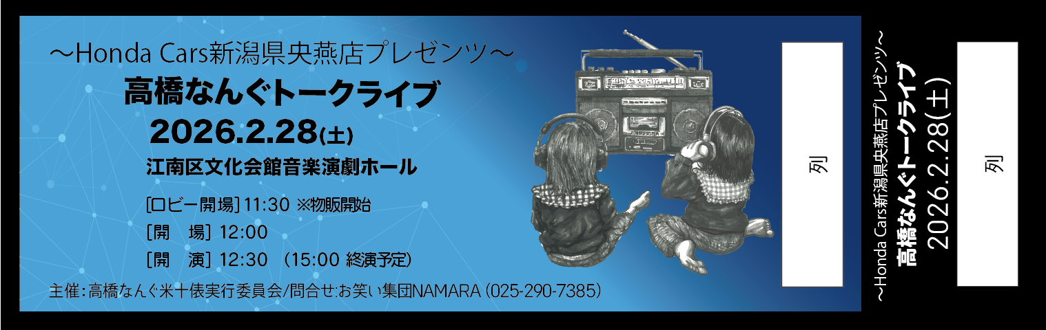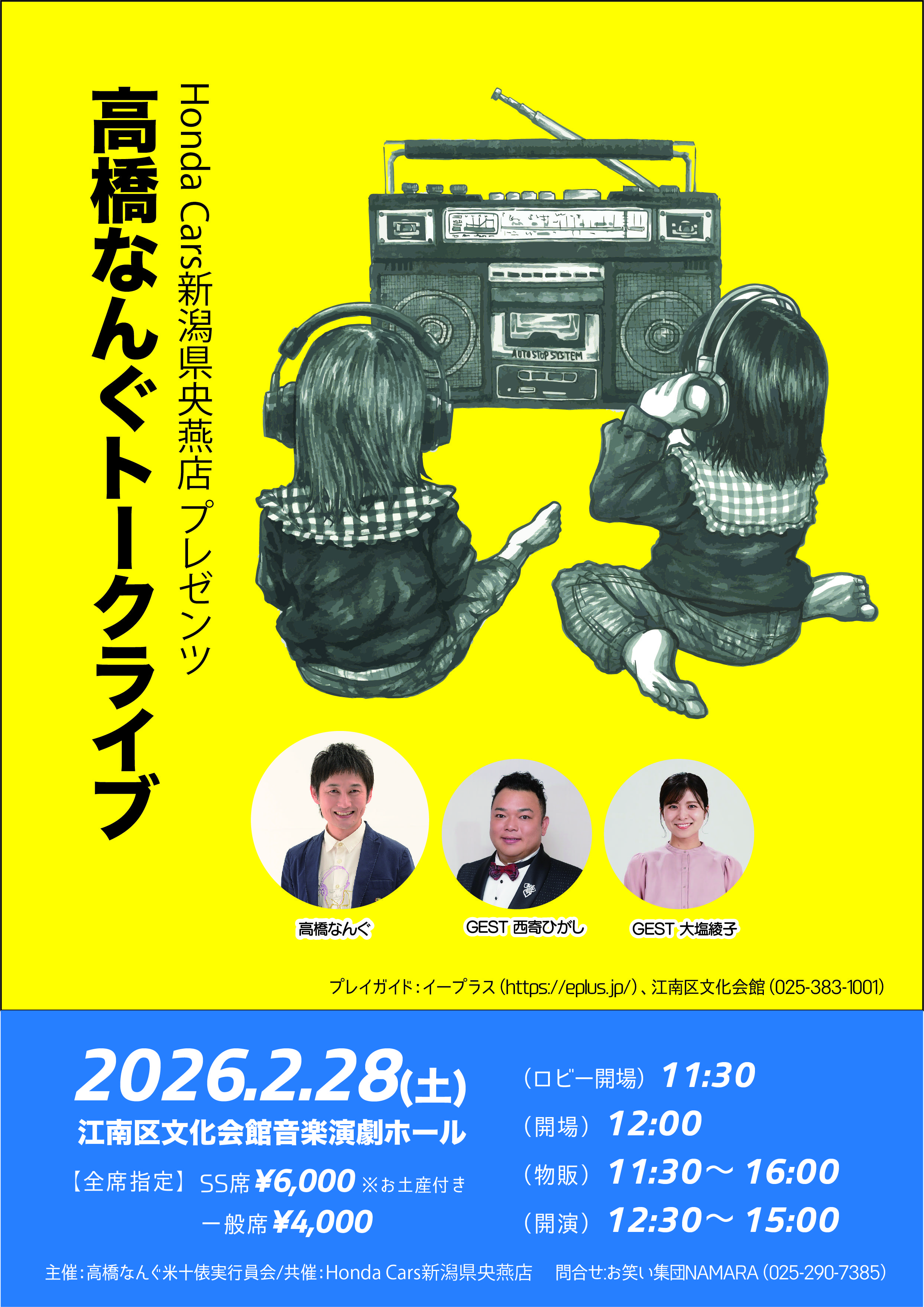 | アクセス | 車〉「日本海東北自動車道亀田IC」約5分 「新潟バイパス紫竹山IC」約10分 ※詳しくは江南区文化会館HPをご確認ください。 |